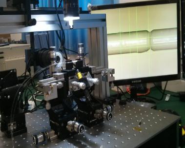 (c)六維對準平臺 (d)紫外固化過程 (e)多芯光纖復用/解復用器實物圖