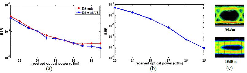 (a)在上行傳輸存在的條件下的下行信號傳輸結果(b)上行信號傳輸結果(c) -8dBm和-15dBm接收功率時的眼圖
