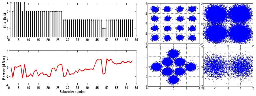 其次,在此架構基礎上進行了優化改進,一方面通過在接收端采用RSOA實現低成本無色ONU,另一方面采用更高級調制格式以及自適應調制增加系統容量。在新的架構中,下行信號在調制后經過外層5個芯傳輸到ONU端,對于上行信號的載波,通過外層第六個芯單獨進行傳輸到ONU端進行RSOA再調制后,從中間芯進行傳輸。另外,對于移動回傳信號,采用偏振復用以增加容量,速率達到48Gb/s。該接入網架構如圖8所示。實驗示意圖如圖9所示。在實驗中,由于RSOA帶寬有限,采用注水算法對其進行自適應調制OFDM信號,使其在1.25G帶寬下傳輸速率達到3.12Gb/s。最終實現下行50個用戶,單個用戶接入速率5Gb/s,系統容量達到250Gb/s。上行速率達到3.12Gb/s,且兼容移動回傳業務,容量達到48Gb/s。實驗結果如圖10、圖11所示。