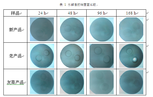 將研磨后的大模場(chǎng)器件用保偏光纖端面裸露在高溫高濕(85?C,85%RH)環(huán)境下定期觀察。分別觀察24h,48 h,96h和168 h時(shí)光纖端面的水解情況,每種光纖取典型的端面如表1所示。可以看出,老產(chǎn)品出現(xiàn)端面應(yīng)力區(qū)水解的情況,新產(chǎn)品在水解方面,性能與友商相同,甚至更好。