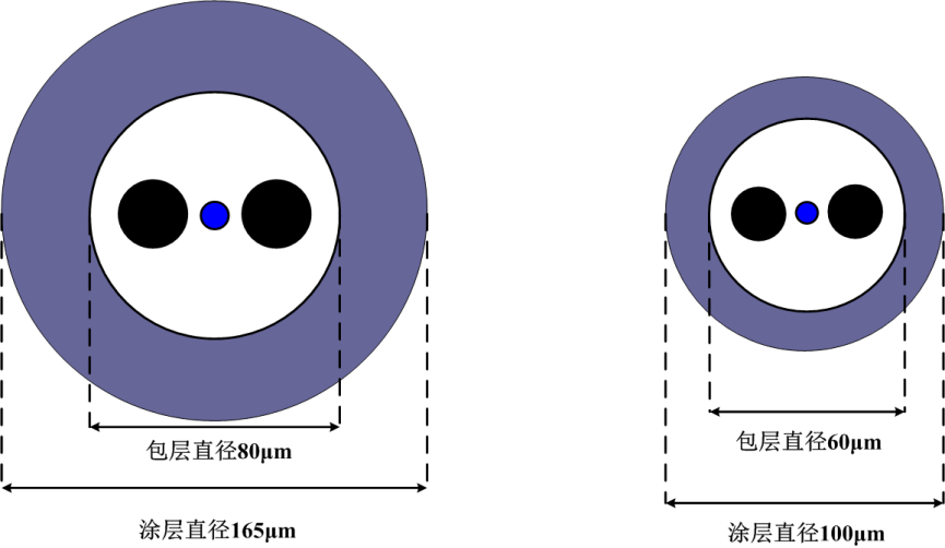 長(zhǎng)飛公司60μm細(xì)徑保偏光纖,通過減小光纖包層直徑從80μm至60μm,涂層直徑從165μm至100μm,從根本上降低了光纖所占體積,節(jié)省了超35%的體積,如圖3。