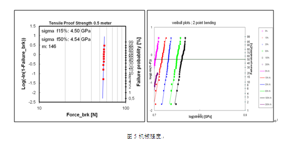 根據(jù)以上測(cè)試結(jié)果,可得到長(zhǎng)飛公司60μm細(xì)徑保偏光纖50%拉斷概率強(qiáng)度為4.54GPa,應(yīng)力疲勞參數(shù)nd值為21.2,高于國際標(biāo)準(zhǔn)要求。