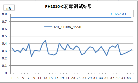 上圖是PH1010-C在φ20mm彎曲情況下,1550nm波段宏彎測試結果。可以看出,在φ20mm及以上彎曲直徑下,宏彎損耗都小于0.5dB,也遠低于G.657.A1的ITU-T所規定標準。