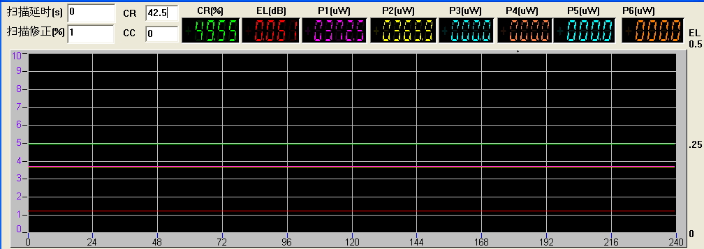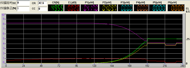 拉錐性能驗證:光纖在熔融拉伸過程中,材料缺陷和波導結構變化等原因,會導致器件的光功率損失。該驗證就是根據器件光功率損耗的大小和器件的穩定性直接評估該光纖是否適合制作熔融拉錐型光纖器件。下圖是PH1010-C光纖進行拉錐得到的功率/損耗曲線,記錄了光纖從開始拉伸直至光纖拉錐機停機整個過程中功率/損耗隨拉伸長度的變化(P1是光纖輸出功率,EL是附加損耗,CR是分光比)。驗證采用1310/1550nm單模泵浦光源,拉錐期間PH1010-C光纖的損耗波動很平緩,損耗始終低于0.1dB。