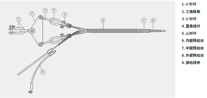 • 整套預絞式耐張線夾包括:外層預絞絲、內(nèi)層預絞絲、配套連接件、接地線等。
