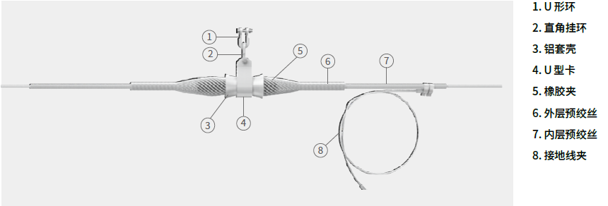 • OPGW 預絞式懸垂線夾依線路跨距、落差及張力的大小分雙層預絞絲單懸掛點懸垂線夾(簡稱單懸垂線夾)、雙層預絞絲雙懸掛點懸垂線夾(簡稱雙懸垂線夾)。