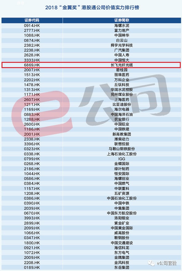 10月19日,“廓清迷霧 洞見未來”——證券時報2018“金翼獎”港股通公司價值盛典在深圳四季酒店舉行。會上,2018“金翼獎”港股通公司價值盛典4大獎項共計135個上榜名單正式揭曉!長飛光纖光纜股份有限公司(以下簡稱“長飛公司”,股票代碼:601869.SH、06869.HK)入選2018“金翼獎”港股通公司價值實力排行榜!