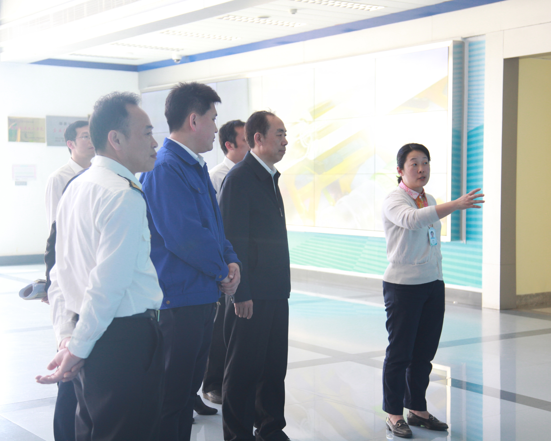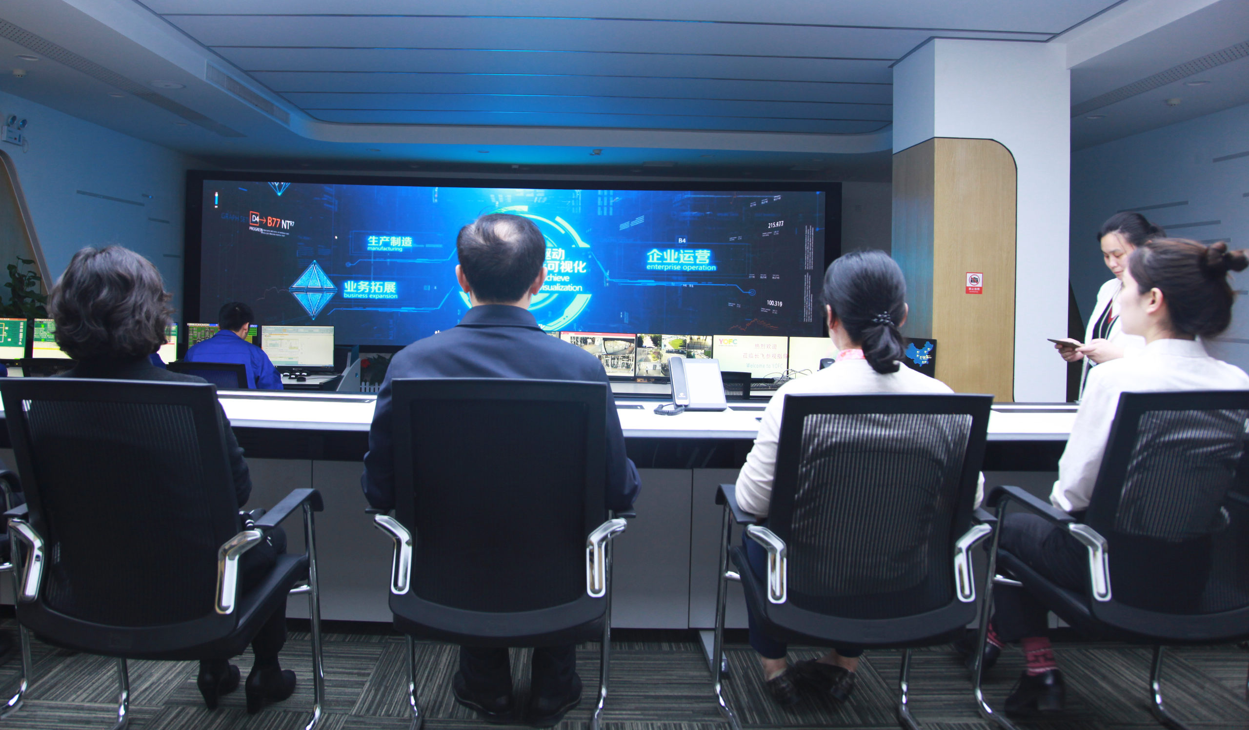 參觀車間時,周理晶向王關長一行重點介紹了光纖預制棒、光纖產品的主要生產工藝流程。為了進一步了解長飛公司智能制造成果,王關長一行還參觀了有“長飛智腦”之稱的集團運營指揮中心,該中心由長飛公司自主設計、建設,能對集團主要生產設備的綜合運行效率、工藝生產數據、動力設備運行狀態等進行實時在線監控、預警。