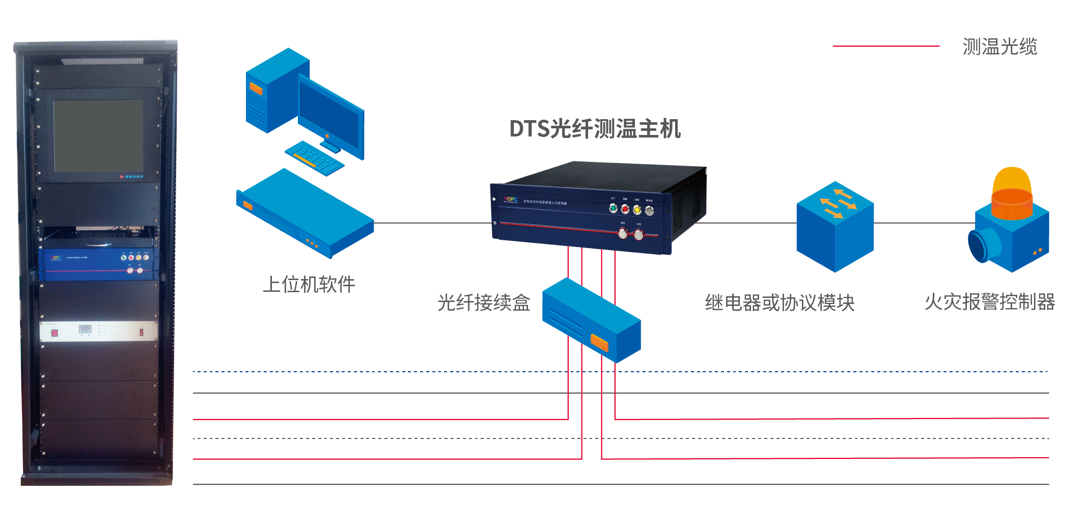 • 報警功能:定溫報警、區域溫差報警、溫升過快報警、斷纖報警、裝置異常等報警