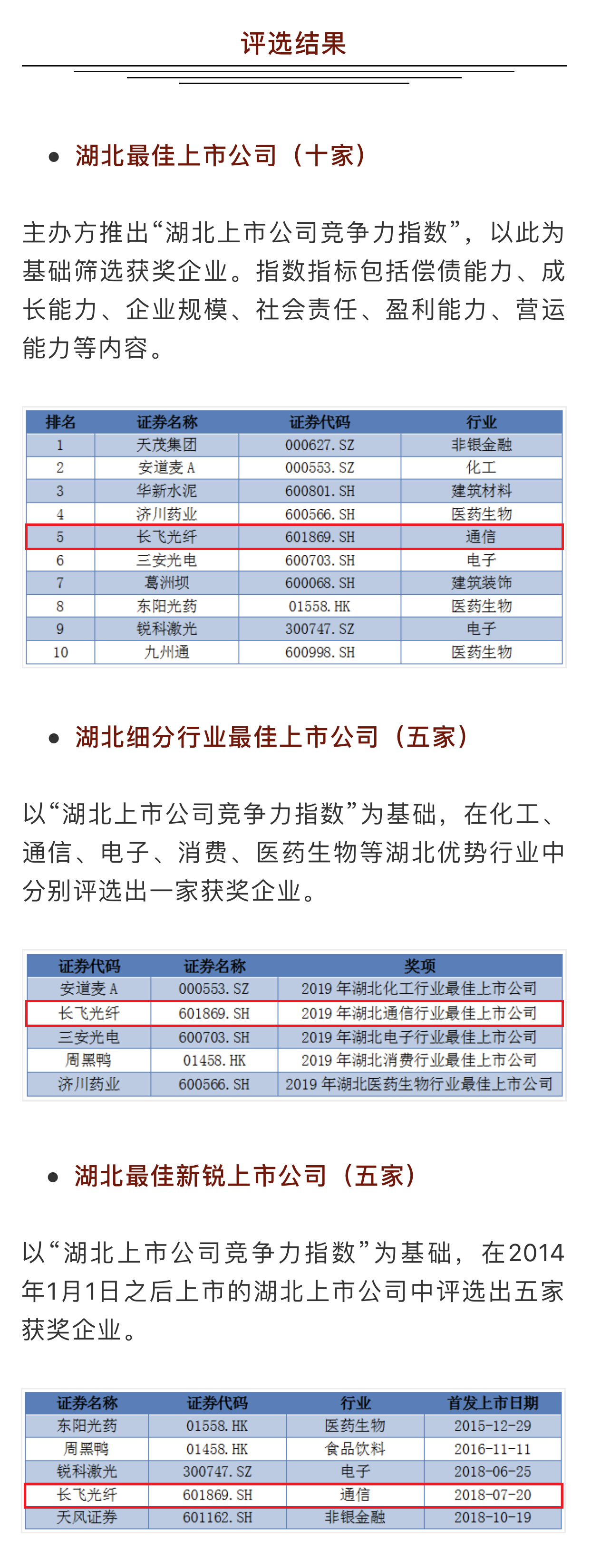 昨日,由湖北日報傳媒集團主辦、支點雜志/支點財經承辦的“2019年度(首屆)湖北最佳上市公司評選”結果公布,長飛光纖光纜股份有限公司(以下簡稱“長飛公司”,股票代碼:601869.SH、06869.HK)榮獲“湖北最佳上市公司”、“湖北通信行業最佳上市公司”、“湖北最佳新銳上市公司”等三項大獎。