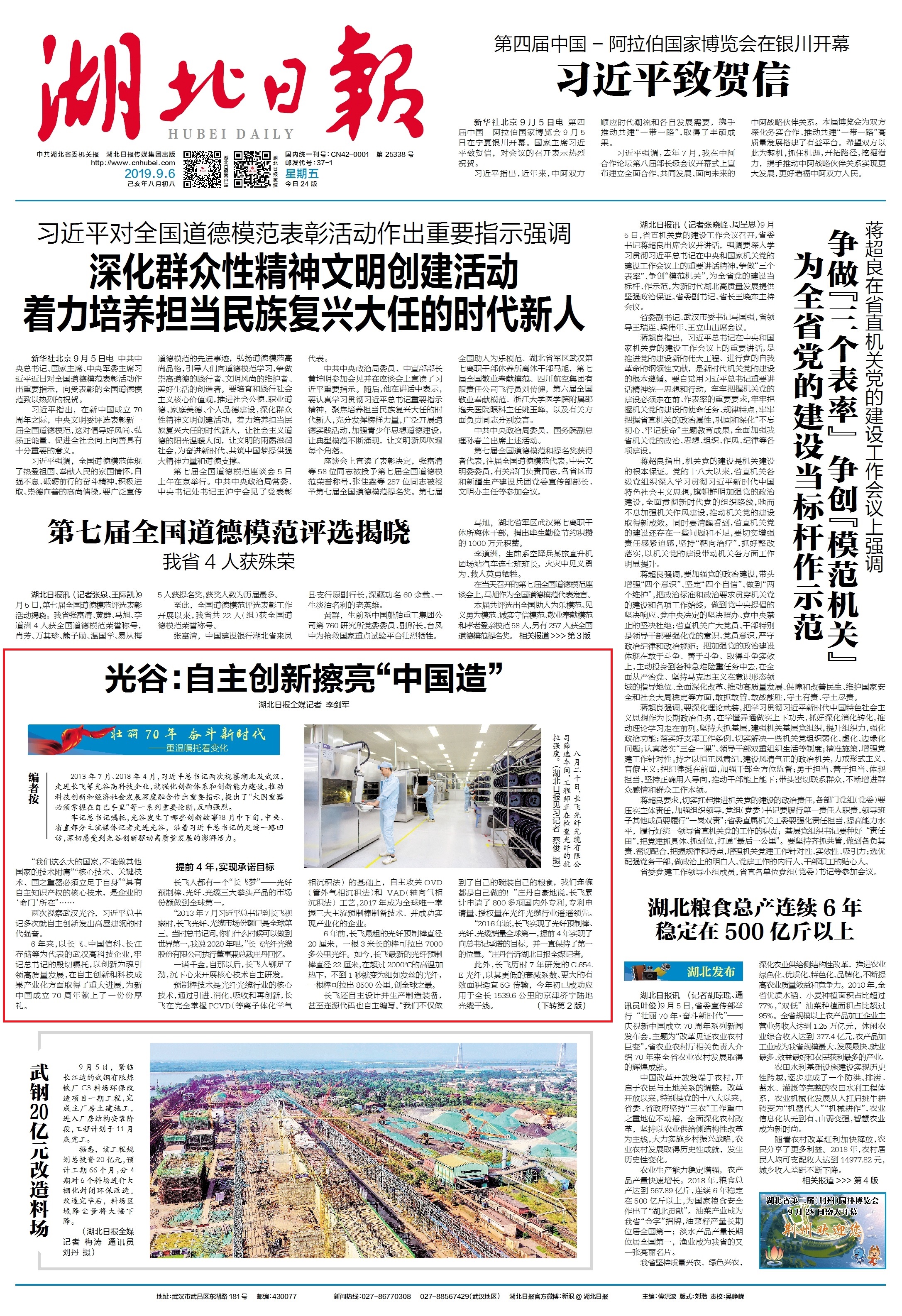 9月6日,《湖北日報》頭版刊文報道《光谷:自主創新擦亮“中國造”》,中共中央宣傳部“學習強國”學習平臺轉載,密切關注湖北武漢光谷、長飛公司自主創新情況。