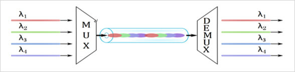 在傳輸速率提升的推動(dòng)下,多模光纖的應(yīng)用近幾年出現(xiàn)了三個(gè)重要變化:一是單波長(zhǎng)已經(jīng)達(dá)到25G、50G;二是并行技術(shù)(Parallel Optics Technology,采用MPO連接器)大量采用;三是短波波分復(fù)用(SWDM,Short Wavelength Division Multiplexing,見圖1)相關(guān)產(chǎn)業(yè)鏈逐步成熟。這些對(duì)多模光纖提出了新的要求,特別是多模光纖的幾何和帶寬性能,以及產(chǎn)品的一致性和均勻性。