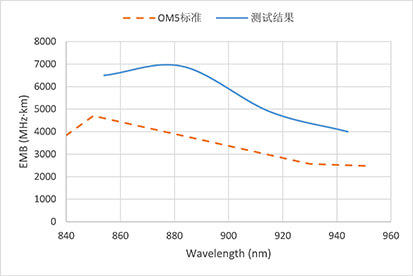 準單模傳輸是將大部分能量能夠注入到多模光纖的基模中,并在較長的距離能保持準單模的傳輸狀態(tài),使多模光纖能夠實現(xiàn)單模光纖的傳輸性能。單多模通用型光纖的芯層采用拋物線型折射率分布,受益于長飛PCVD技術,能夠實現(xiàn)850nm至950nm波段優(yōu)異的帶寬性能,滿足OM5的帶寬要求,在短距離傳輸中具有低成本、低功耗的優(yōu)勢;同時采用抗彎的結構設計,具有優(yōu)異的彎曲不敏感性能。