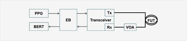 采用商用的多模和單模光模塊,測試單多模通用型光纖的傳輸性能。脈沖模式發(fā)生器(PPG)生成速率為25.78Gb/s的 215-1偽隨機二進制序列(PRBS),并通過評估板(EB)調制光模塊。采用可變光衰減(VOA)來調節(jié)收發(fā)器的接收光功率,輸出的電信號由誤碼儀(BERT)檢測,如圖3所示。