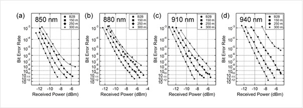 采用Finisar的100G SWDM4多模光模塊,測試光纖的多模傳輸性能,誤碼率曲線如圖4所示。對于短波長波分復用的四個波長,300m鏈路傳輸?shù)恼`碼率低于IEEE 802.3標準建議的FEC極限(5×10-5),表明單多模通用型光纖在850nm~950nm的波段可以傳輸300m。