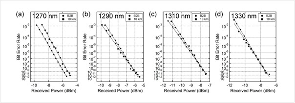 單波長的SR4和PSM4的測試結果在此不做贅述。兼具單模光纖和多模光纖優(yōu)勢,該光纖的無誤碼傳輸距離如表1所示。
