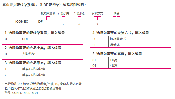 UDF 系列光纖配線架為室內/ 外光纜、垂直主干光纜與網絡設備之間提供互聯或交叉連接。可安裝MPO 轉LC(MPO 等)模塊、配線面板、熔纖盒等功能模塊。既支持預端接方式,也支持熔接方式。適用標準19 英寸設備機柜或機架安裝。備有1U 和4U 光纖配線架。1U 高度最大支持預端接/ 熔接144 芯(雙LC 適配器)或72 口MPO,4U 高度最大支持預端接/ 熔接576 芯(雙LC 適配器)或288 口MPO。