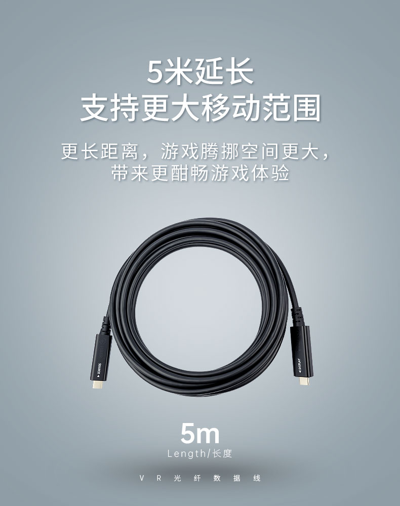 這款VR光纖數據線長達5米,采用長飛公司特種抗彎光纖,線材輕柔細軟,連接VR眼鏡后,使得人體動作不受束縛,可提供更大的移動空間,真正讓受眾享有自由輕松的沉浸式體驗。同時,線材的光纖材料不產生電磁干擾,其極低的信號衰減率,使觀影大片畫質清晰、流暢穩定,使游戲視頻幾乎無卡頓,相較銅線傳輸信號更穩定、更完整。