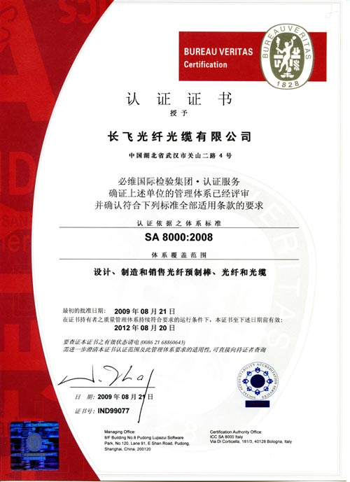 長飛公司社會責任管理體系經過9個月的運行,于2009年6月通過了法國必維國檢檢驗集團認證,獲得經社會責任國際機構守信的認證證書。