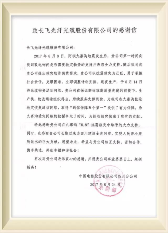 近日,長飛光纖光纜股份有限公司(以下簡稱“長飛公司”,股票代碼:6869.HK)收到了一封來自中國電信股份有限公司四川分公司(以下簡稱“中國電信四川分公司”)的感謝信,信中表達(dá)了中國電信四川分公司對長飛公司全力支援四川阿壩州九寨溝地震救災(zāi)工作的感謝。