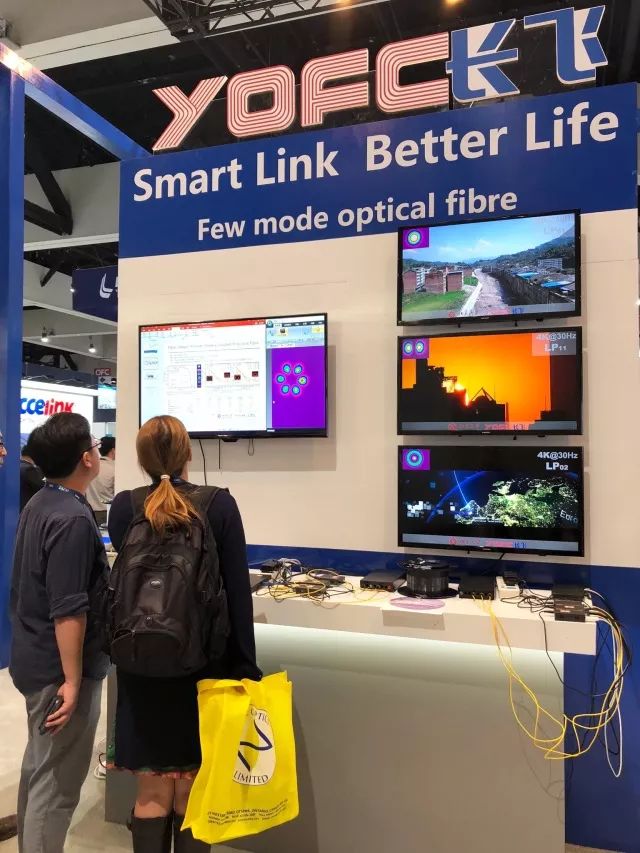在本屆OFC的展臺上,長飛公司重點展示了少模光纖通信系統在視頻傳輸上的應用,現場進行了通過一根少模光纖的3個不同模式分別傳輸3套4K高清視頻的實時演示,直觀展示少模光纖在通信上的實際應用效果,讓人們感受到少模通信應用就在身邊,可以進入到家庭生活之中。本次展示吸引了大量學術界及行業內人士的圍觀,成為OFC展覽的一大亮點。