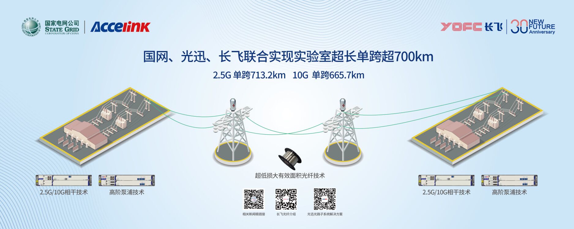 此次和國網信通、光迅科技合作實現創紀錄的2.5G和10G超長單跨距無中繼光傳輸,顯示了長飛公司新型光纖制備技術在超長單跨距無中繼系統中的領先優勢和多年來在光纖通信領域的技術創新實力,與此同時,這一系列的成功實驗,為長飛公司超低損耗大有效面積光纖在電力通信長跨距傳輸領域奠定了堅實的技術基礎,積累了豐富的經驗。