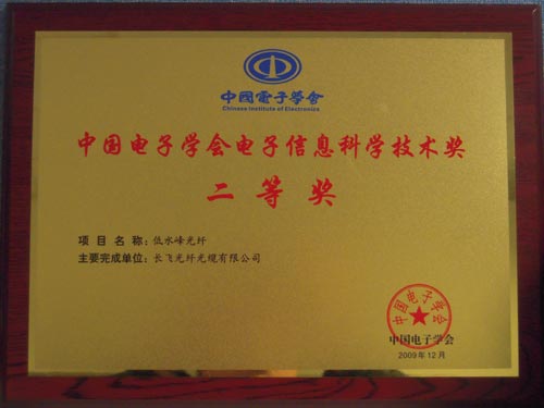 經中國電子學會電子信息科學技術獎評委會評選,由長飛公司完成的項目“低水峰光纖”榮獲“2009年度中國電子學會電子信息科學技術獎”的二等獎。
